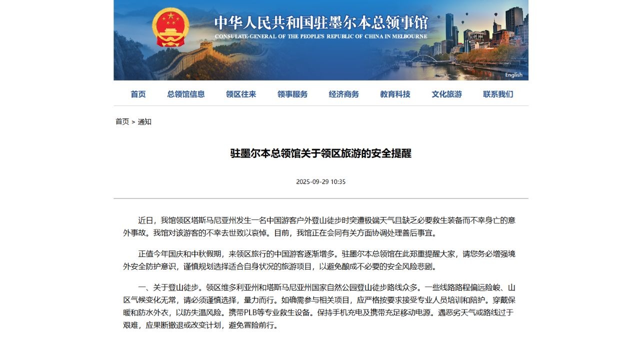 中國駐墨爾本總領館周一(6日)證實,澳洲維多利亞省和塔斯曼尼亞省近日接連發生中國公民登山時意外身亡事故,總領館提醒境外旅遊須以安全為重,做好充分準備。