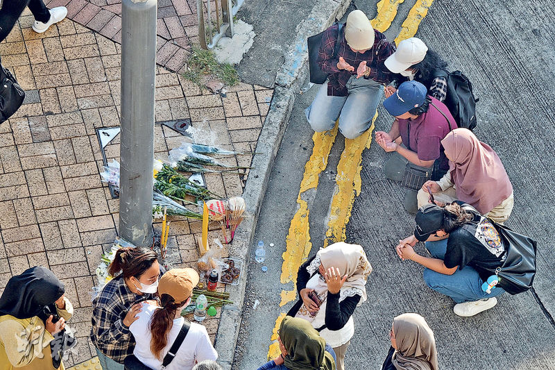 兩名死者的家屬和親友昨午返回意外現場拜祭,一行約30人擺放鮮花、零食、香燭、祭品等,道士在場主持儀式。儀式完結時,有家屬大喊「婆婆、婆婆……」,亦有家屬叫「婆婆,安息啦」。印傭死者的親友亦有到場,帶同冬甩、甜品、飲料等,有人用水清理地上及燈柱旁邊的血迹,有人流淚。