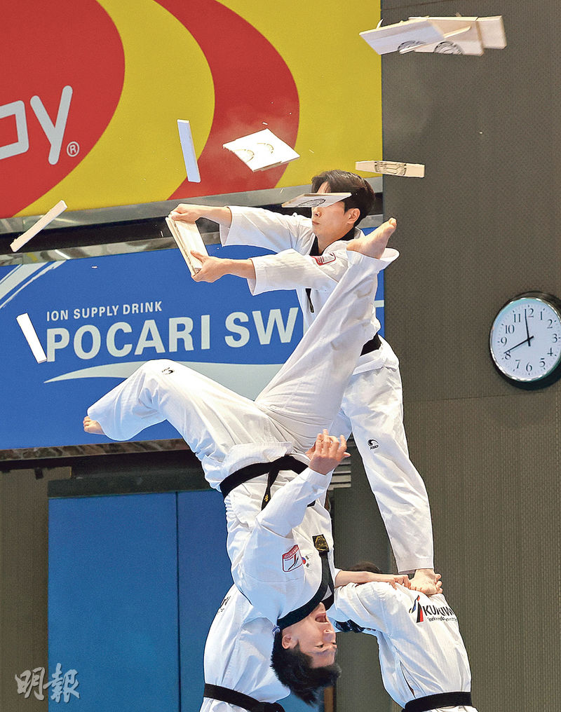 【明報專訊】韓國駐港總領事館今個月舉辦「韓國十月文化節」,今年以首屆「韓國總領事盃跆拳道大賽」打頭陣。韓國國技院約20個跆拳道高手專程來港表演,噚日喺灣仔修頓場館獻技,連續做10幾下踢板、凌空翻身再踢板都無問題,現場隨即報以熱烈歡呼同掌聲。