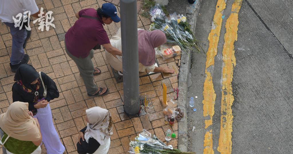 兩名死者的家屬和親友今午(7日)返回案發現場拜祭,親屬擺放白色鮮花、香燭、祭品,道士在場主持儀式。儀式完結時,有家屬大喊「婆婆、婆婆、婆婆……」,亦有親屬叫「婆婆,安息啦」。37歲印傭死者的朋友亦有到場拜祭,印傭的親友帶同冬甩、甜品、飲料等到場,有人用水清理地上及燈柱旁邊的血迹。