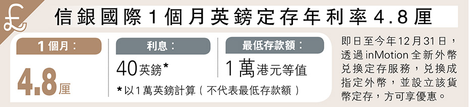 經濟 信銀國際1個月英鎊定存年利率4.8厘 發佈於 4 天 前 2025 年 10 月 9 日 By 明報 【明報專訊】即日至今年12月31日,透過inMotion全新外幣兌換定存服務,兌換成指定外幣,並設立該貨幣定存,方可享優惠。(圖) 日報新聞-相關報道: 匯立1個月港元定存年利率8.8厘 (2025-10-09) 相關文章:匯立1個月港元定存年利率8.8厘 (2025-10-09) Up Next 匯控擬千億私有化恒生 品牌保留 收購價溢價三成 預告停回購3季補充資本 不要錯過 基金特區:瑞士百達未來10年看好歐股 「美國例外論」或消退 資金撤出美股 繼續閱讀 贊助商 猜你喜歡