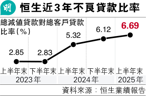 艾橋智稱,目前部分商業房地產地產領域已開始正常化,例如住宅市場已見穩定,辦公室在政府措施支持下,在中期可以改善供求關係,雖然房地產信貸問題未來數季仍要處理,但部分領域的挑戰已逐見減少。今年上半年,恒生期末減值貸款按年再增兩成至548.21億元,艾橋智稱恒生雖有較高壞帳,但其資本強勁,普通股權一級資本(CET1)比率約21%、貸存比率60%,流動性比率高,有力應付短期信貸質素挑戰。