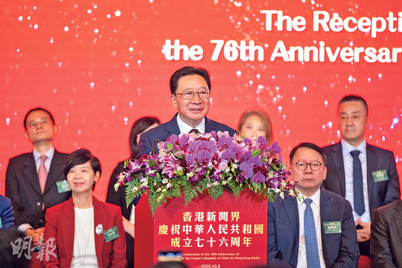 周霽、李家超、駐港國安公署副署長陳楓、政務司長陳國基等昨出席新聞界國慶酒會。周霽致辭時提到,新聞界應「眼裏有家國」,包括「多用老百姓的笑臉闡釋中國式現代化」、「多用國際社會聽得懂的語言和方式傳播中國聲音」,向國際社會展示真實及全面的中國,展示「真實、立體、全面的中國」及「可信、可愛、可敬的中國形象」,並宣揚一國兩制的優勢。