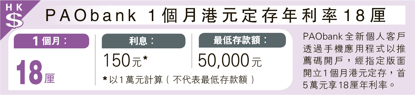 經濟 PAObank 1個月港元定存年利率18厘 發佈於 2 週 前 2025 年 10 月 10 日 By 明報 【明報專訊】PAObank全新個人客戶透過手機應用程式以推薦碼開戶,經指定版面開立1個月港元定存,首5萬元享18厘年利率。 日報新聞-相關報道: 富邦1個月澳元定存年利率5.38厘 (2025-10-10) 相關文章:富邦1個月澳元定存年利率5.38厘 (2025-10-10) Up Next 法國外貿銀行:關稅不撤將打擊明年經濟 不要錯過 港股9月日均成交3167億 創新高 繼續閱讀 贊助商 猜你喜歡