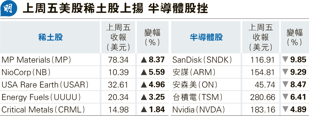 道指上周五在傳統消費股支持下,跌1.9%,收報45,479點,三大指數全周均下跌逾2%。中國周四公布,最終用途為研發生產14納米及以下邏輯晶片等稀土出口申請需逐案審批,或影響用於手機、人工智能等不同領域的半導體供應鏈,反映半導體企業表現的費城半導體指數上周五跌6.32%,台積電(美:TSM)跌6.41%,用於汽車、工業等傳統領域晶片的安森美(美:ON)亦跌8.47%。美國稀土股則大升,MP Materials(美:MP)升8.37%,NioCorp(美:NB)升5.59%。