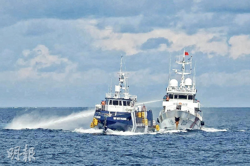 【明報專訊】中菲在南海衝突持續,中國海警局昨(12日)稱,兩艘菲律賓公務船未經允許非法闖入南沙群島鐵線礁附近海域,並無視多次嚴正警告危險接近中方正常維權執法的海警導致發生擦碰。菲律賓則指控,中方向菲公務船發射水炮,並刻意衝撞菲方船舶船尾,此舉是「明顯的威脅」,馬尼拉將提出外交抗議。