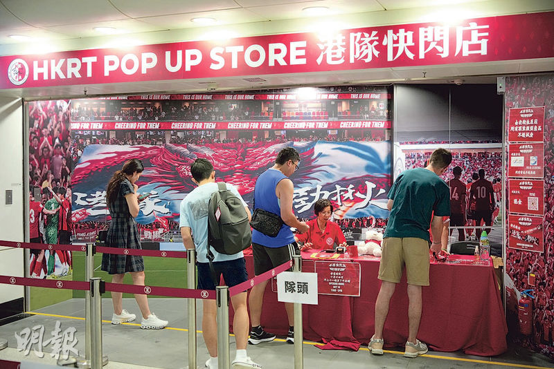 【明報專訊】港足主場球衣由上周六早上起再次開售後曾大排長龍,結果4個銷售點不足兩日均已暫時全部售罄。除了鄰近啟德主場館的港鐵宋皇臺站,至今午5時賽前開設港隊官方限定快閃店,售賣紅龍巨畫(Tifo)圖案打氣毛巾等周邊產品;啟德主場館內亦有「主場之龍」紀念Tee售賣。
