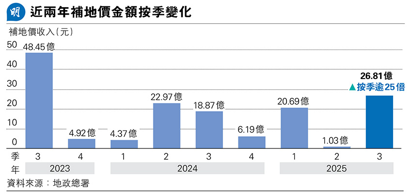 【明報專訊】發展商趁樓價回落,近季積極完成補地價項目,令政府土地收入大增。地政總署最新公布,上季(即7月至9月)補地價涉逾26.8億元,較前一季逾1億元按季大增25倍,為2023年第三季錄得逾48.4億元後,近8季、即兩年最多(見圖);連同今年已售出的4幅官地(見表)涉約59.75億元,首3季土地收入已升破百億元大關,達至逾108億元水平,已超越去年全年近70億元逾五成。有業界指出,政府近期批出補地價比往年大幅折讓,加上致力推展北部都會區,加快相關項目完成補價,令土地收入上升,預計不排除未來將再有一至兩宗金額較大的補價個案。