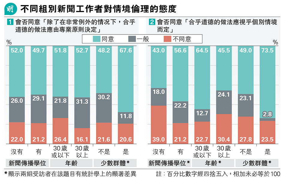 若以年齡劃分,30歲或以下的受訪者,會更傾向認同合乎道德的做法應該視乎個別情境而定。年齡組別之間的差異,也許是當下年輕世代的特徵。另一個可能解釋是,較年輕的記者會較多仍然在「跑前線」,身處新聞現場的機會相對多一點,因此可能更傾向認同記者要在現場根據情境細節做判斷。