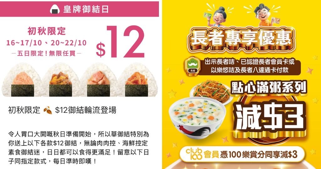大家樂「點心滿粥系列」長者減$3 華御結推$12飯糰 壽司郎限定壽司$10起|著數情報 (12:39)