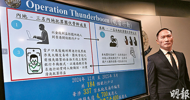 【明報專訊】警方聯同內地公安搗破一個跨境洗黑錢集團,集團涉嫌招攬內地人來港開設傀儡銀行戶口,並預錄自拍影片,方便集團成員日後通過銀行實時人臉識別,操作戶口洗黑錢,9個月清洗約2.74億元。兩地共拘捕3人,其中一名本地男骨幹成員被控3項洗黑錢罪,案件昨午提堂,被告暫毋須答辯,還押至明年1月再訊。