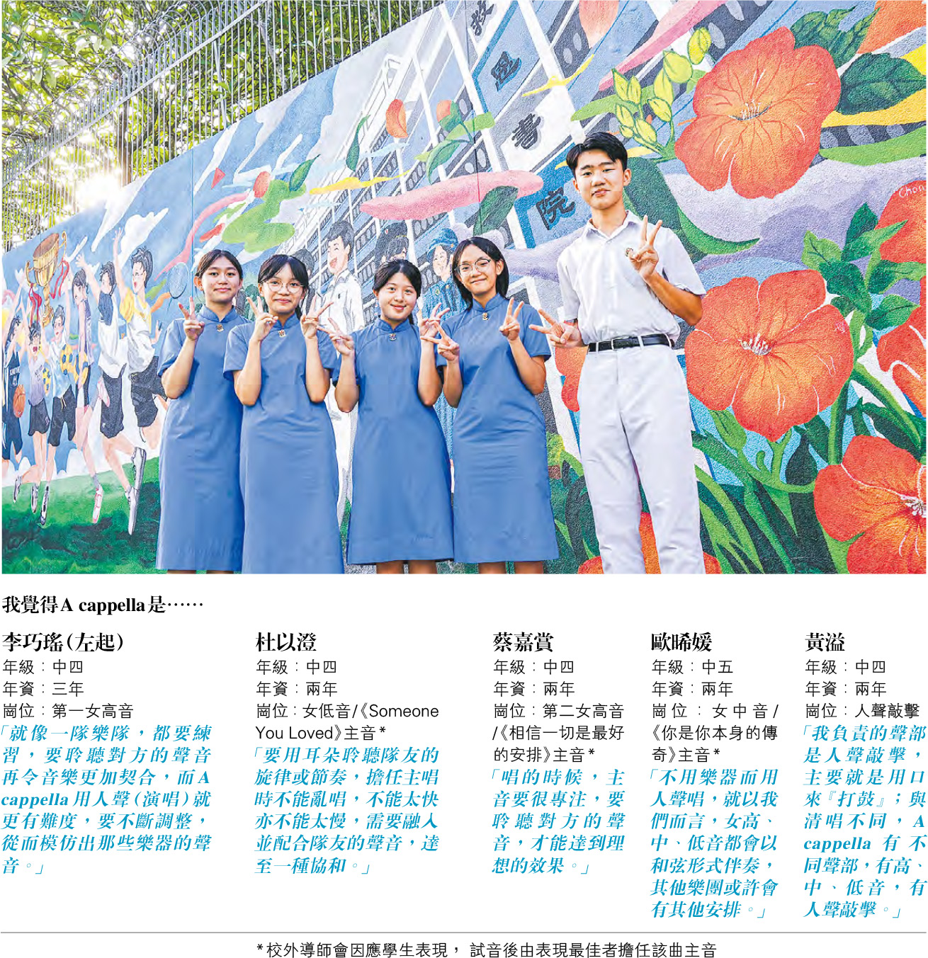 教育 中學限定:聽得見的青春與花音——救恩書院無伴奏合唱團Oxygen 發佈於 4 天 前 2025 年 10 月 17 日 By 明報 【明報專訊】在救恩書院無伴奏合唱團Oxygen的表演中,主音演唱聲外,配有以人聲模擬的鼓聲節拍,負責和音的團員又分別以高、中、低音唱出長短不一的花音「doo」、「woo」、「ah」、「la」,為主音旋律鋪墊出富層次的和弦。Oxygen的表演,也唱出團員之間的關係與連結。女中音歐晞媛認為,團員表演和訓練時很純粹而青春,他們單純因為一句「我鍾意唱歌」,有共同興趣與喜好,就一起努力做好表演。 日報新聞-相關報道: 中學限定:多道聲音,一種協和 (2025-10-17) 相關文章:中學限定:多道聲音,一種協和 (2025-10-17)語文同樂 第794期 不要錯過 大人物小故事:「藥王」孫思邈 繼續閱讀 贊助商 猜你喜歡 中學限定:多道聲音,一種協和 書之異世界:穿西裝的死神按門鈴——《死亡預告》給生者的啟示 寫乜東東:愛在記憶中尋味──以食物書寫回憶 有價講:子思的超前部署 人形圖鑑:最超現實的房子都有最寫實的廚房——訪馬格利特故居