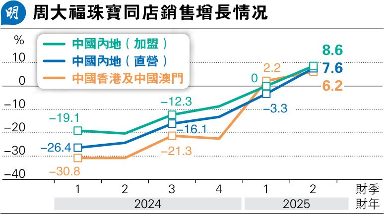 【明報專訊】珠寶首飾股周大福(1929)公布,截至今年9月底的第二季零售值按年增長4.1%,當中內地增長3%,港澳及其他市場增長11.4%。集團形容,第二季度是業務的重要轉捩點,受惠於定價產品的強勁增長勢頭及計價黃金產品的改善趨勢,內地及港澳同店銷售增長均全面回升,當中內地直營店同店銷售更是結束連續6季跌勢,在第二季轉升7.6%(見圖),加盟店同店亦轉升8.6%。港澳同店則連升兩季,第二季同店續升6.2%,其中香港上升3.2%,澳門則升17.3%。