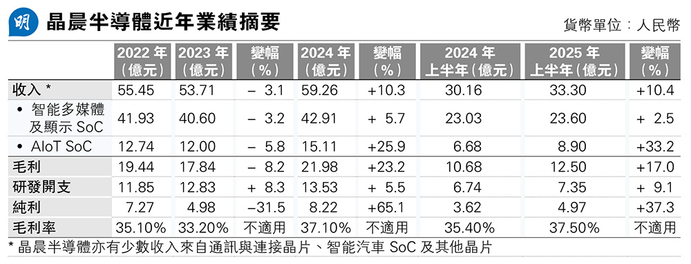 晶晨是次來港招股,中金及海通國際為聯席保薦人。相對中芯及華虹H股,晶晨年初以來升幅相對「失色」,但其實累計升幅亦達56%。截至上周五公司市值達492億元,論規模當然亦遠不及中芯的6203億元,亦不及華虹的1417億元,惟在半導體產業鏈當中,晶晨於SoC亦有其行業地位。根據弗若斯特沙利文報告,按2024年的相關收入計,晶晨在專注於智能終端SoC晶片的廠商中位列全球第四,在家庭智能終端SoC晶片領域位列中國大陸第一、全球第二。其核心產品應用於多種應用場景,包括智能家居、商業教育、智能汽車及個人移動設備。