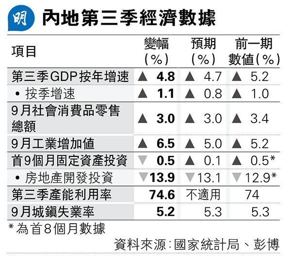 【明報專訊】國家統計局公布,內地第三季GDP按年增長4.8%,高於市場預期的4.7%,不過較第二季增速5.2%放緩。內地經濟消費、投資增速自6月以來開始放緩,其中首9個月全國固定資產投資按年跌0.5%,扭轉首8個月增長0.5%,是2020年8月以來首次錄得按年收縮。內地GDP首三季累計按年增長5.2%,統計局新聞發言人表示,第三季增速放緩為外部環境複雜、國內結構調整壓力等因素共同導致,強調實現全年約5%增長目標有基礎、有支撐,惟需付出艱苦努力。