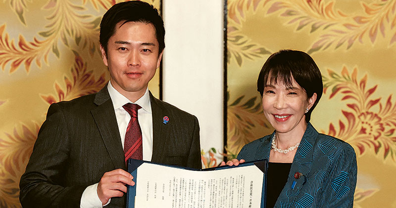 高市在與吉村簽署協議時說:「我非常期待與你合作,共同增強日本經濟實力,並重塑日本成為對未來世代負責任的國家。」吉村表示,他確信雙方「對推動日本前進的熱情是一致的」。公明黨宣布退出聯合政府僅10天後,自民黨迅速完成重組執政聯盟。根據合作協議,自民黨接受維新會提出的三大核心條件:(一)推動災害發生時支援首都運作的「副首都構想」,力求明年在國會完成立法;(二)落實社會保障改革,且同意定期持續協商;(三)削減眾議院一成議席數目,將在臨時國會提相關法案並推動通過。至於存在重大分歧的廢除企業及團體政治獻金及停徵食品消費稅兩年政策,自、維同意設立新協商機制繼續討論,其中企業獻金議題定在2027年9月高市的自民黨總裁任期屆滿前得出最終結論。