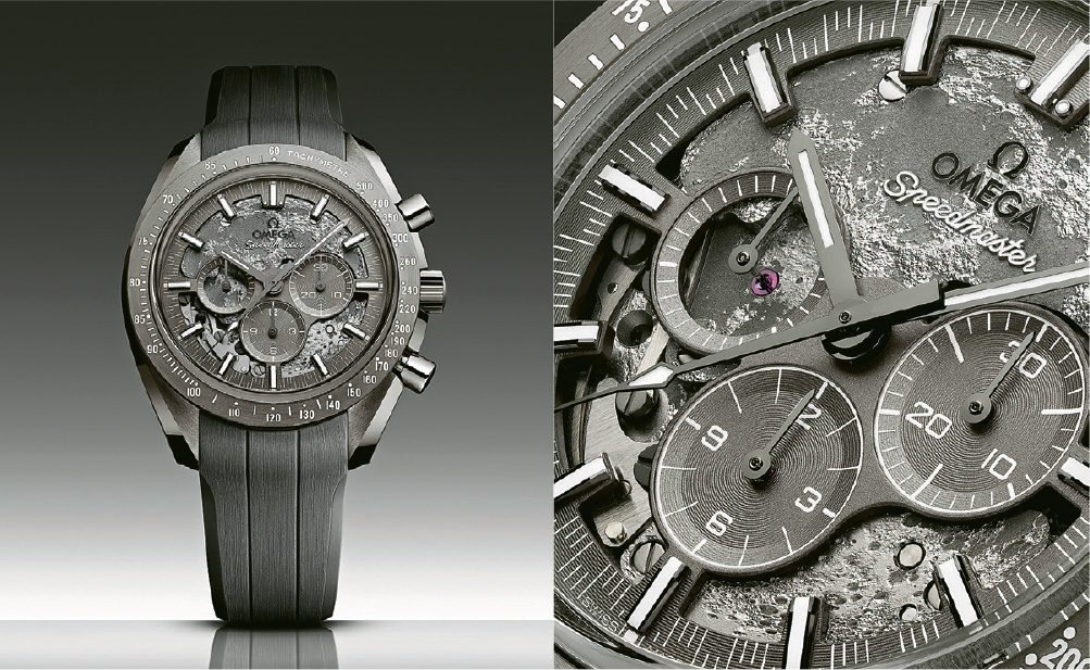 至於Grey Side of the Moon腕表則是太陽神8號任務團隊紀念款式,向最先看到月球背面的幾名太空人致敬,呼應Jim Lovell在任務中看到月球時說的一句話:”The Moon is essentially grey”。腕表配置3869 Co-Axial Master Chronometer手動上鏈機芯,機芯透視雷射蝕刻月球表面圖像,鏤空灰色盤可看到月球正面,月球背面則在底蓋呈現,造型精細逼真。腕表同樣有尼龍纖維表帶和橡膠表帶兩個款式。