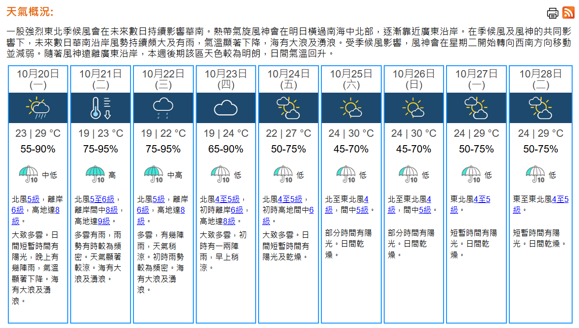 即時熱點 天文台:周一市區料最高氣溫29°C 晚上降至23°C 周二19°C (19:22) 發佈於 4 天 前 2025 年 10 月 19 日 By 明報 本港地區明日(20日,周一)天氣預測:大致多雲。明早氣溫約25°C,日間短暫時間有陽光,最高氣溫約29°C。晚上有幾陣雨,市區氣溫顯著下降至最低約23°C,新界再低一兩度。吹和緩至清勁偏北風,晚間離岸及高地風勢逐漸增強,海有大浪及湧浪。[天文台擬周一黃昏前後直接掛三號波] 展望隨後兩三日風勢持續頗大,多雲有雨,周二(21日)及周三(22日)初時雨勢較為頻密。周二至周四(23日)市區氣溫顯著下降至19°C左右,新界再低兩三度。海有大浪及湧浪。晚上部分沿岸低窪地區可能出現水浸。(天文台) 相關文章:天文台天氣天氣速遞編輯推介 Up Next 天氣|天文台:周二雨勢有時頻密 晚上市區氣溫最低19°C (21:04) 不要錯過 楊振寧逝世|楊振寧82歲時娶28歲翁帆成熱話 恩愛21年 讚翁帆是「上帝恩賜禮物」 (15:31) 繼續閱讀 贊助商 猜你喜歡 天文台上午8時40分錄18.4°C 今年入秋以來最低 (09:03) 天文台取消所有熱帶氣旋警告信號 (18:20) 天氣|天文台:周三有幾陣雨 市區最低19°C (20:57) 風神 | 緩慢趨向西南 海口3港停運 (00:34) 風神|教育局:幼稚園及部分特殊學校明日停課 (17:33) 天文台:下午5時20分直接發出三號強風信號 (12:06)
