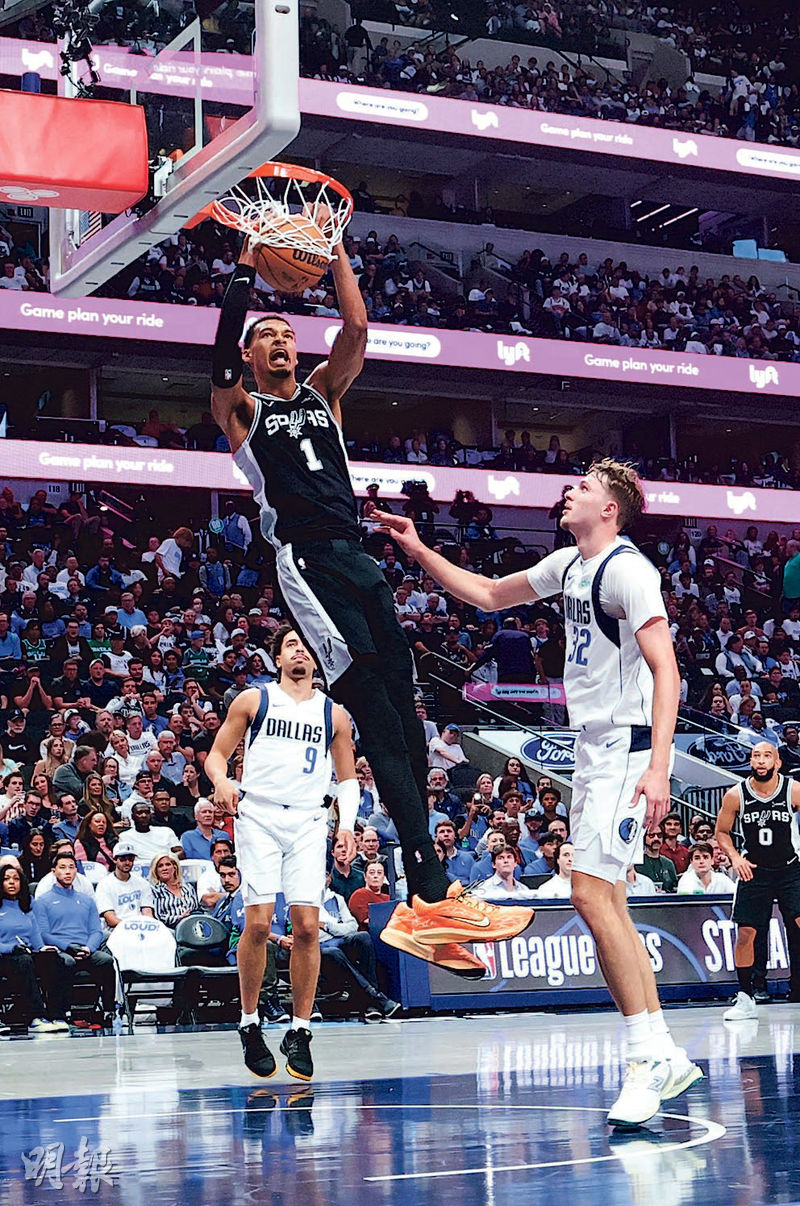 【明報專訊】聖安東尼奧馬刺昨於今季NBA常規賽首戰,憑藉2023年選秀狀元、法國籍中鋒雲班耶馬傷癒復出,僅上陣約30分鐘已交出40分、15個籃板及3個封阻,領銜在「狀元對決」作客以125:92大勝有應屆選秀狀元法拉格僅交出10分及10個籃板的達拉斯獨行俠。
