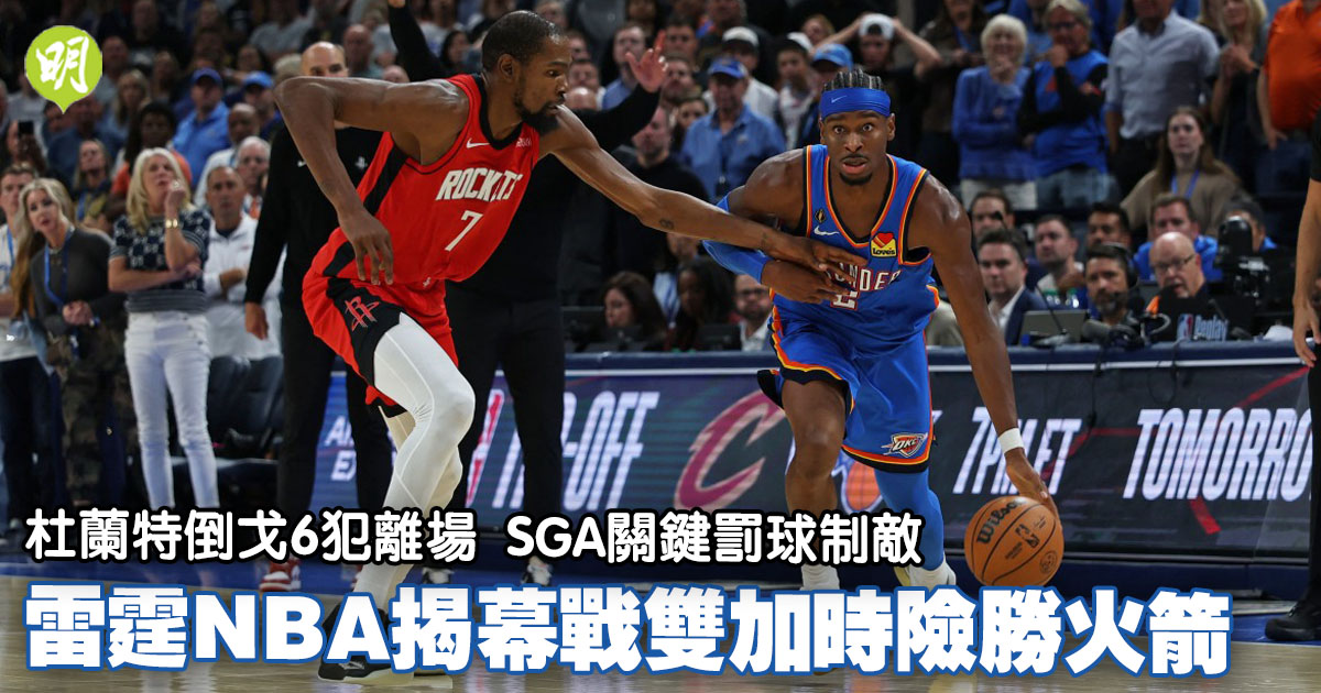 NBA新一季今早(22日)開鑼,衛冕之師奧克拉荷馬雷霆在常規賽揭幕戰激戰至兩次加時後,憑當家球星「SGA」基傑奧斯阿歷山大在尾段博得對方「倒戈」新援杜蘭特犯滿離場下,射入兩個關鍵罰球,助球隊主場以125:124力克侯斯頓火箭旗開得勝。至於金州勇士則有主將占美畢拿攻入16記罰球共獨取31分,作客以119:109擊敗洛杉磯湖人。