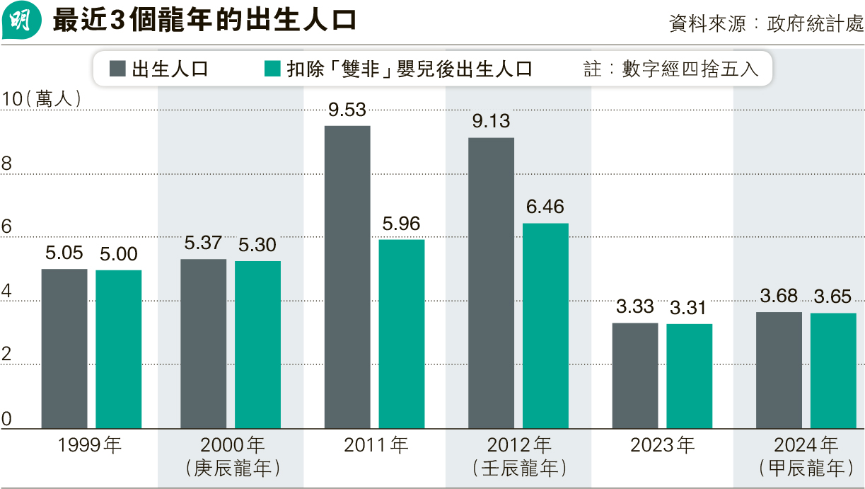 比較過去3個龍年,剔除「雙非孕婦」來港分娩嬰兒數目後,新生嬰兒相比上一年的增長比例,以2024甲辰龍年最高,可以說特區政府在鼓勵生育政策上達到一定效果,有不錯收穫。