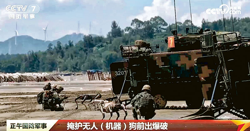 【明報專訊】央視軍事近日披露,解放軍陸軍兩棲部隊在登陸戰演練時,首次大量使用「機械狼」。演習中,部隊使用三種無人裝備,大型無人機對灘頭敵陣地實施垂直投彈打擊;高速穿越機攜炸藥對單兵或輕型作戰車輛打擊;「機械狼」則突破進攻路線上的障礙,直接到達目標區域。軍事自媒體稱,一旦裝備足夠多的機械狼,戰鬥情况將不一樣。