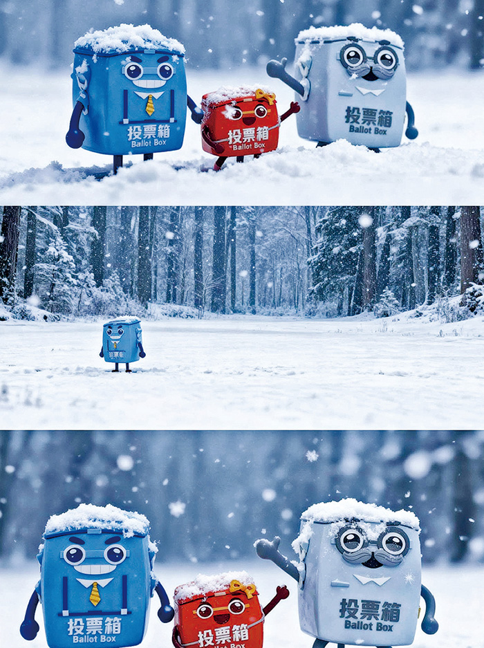 副律政司長張國鈞都追上潮流,將選舉吉祥物「票箱家族」融入AI雪景照(圖),又提醒市民「天氣轉涼,記得添衣。選舉就到,記得投票」。而消防處「任何仁」同樣用AI雪景照呼籲市民投票。廉政公署就用AI整咗條動畫宣傳片,片中小蜜蜂造型嘅廉署人員,聯同廉署咖啡杯、票箱家族一齊呼籲選民踴躍投票,同埋維護廉潔選舉。