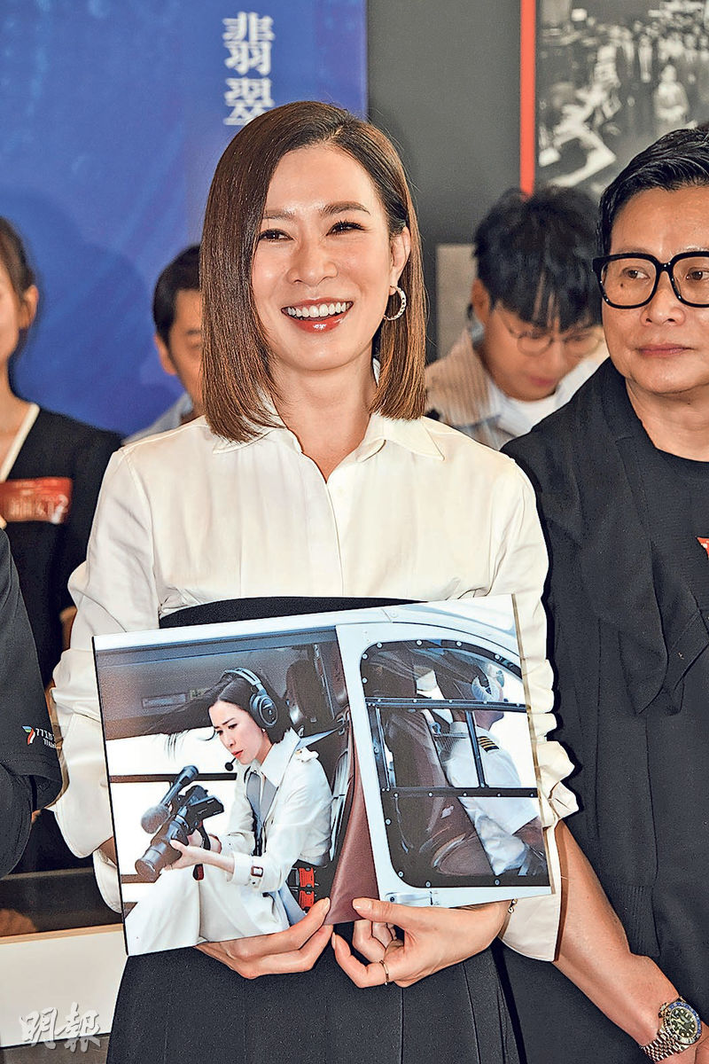 【明報專訊】佘詩曼、王敏奕和馬國明等昨日到紅磡出席無綫台慶劇《新聞女王²》展覽揭幕,佘詩曼、陳曉華及王敏奕拿劇照分享難忘片段,佘詩曼笑言黃宗澤劇中對她太差所以不敢來,特選首集於直升機上拿攝影機的劇照,因代表她飾演的Man姐強勢回歸,「原本拍攝只要求開窗,因要做到極致,我要求在飛行期間開門拍,已扣安全帶,很安全」。