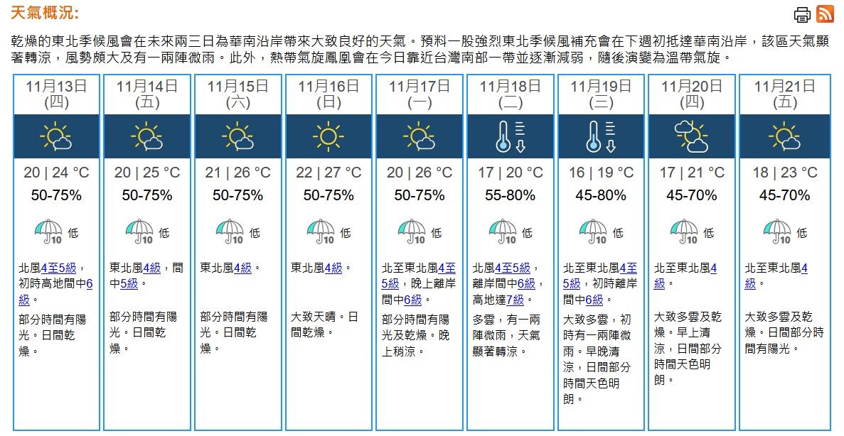 即時熱點 天文台:強烈東北季候風下周初抵華南 本港下周三低見16°C (12:10) 發佈於 1 個月 前 2025 年 11 月 12 日 By 明報 【12:10更新】天文台表示,預料較乾燥的季候風會在本周後期持續影響華南,該區天色好轉,早上稍涼。而一股強烈東北季候風會在下周初抵達華南沿岸,該區天氣顯著轉涼。據天文台的香港九天天氣預報顯示,明日(13日)至下周一(17日)溫度維持在20°C至27°C範圍(詳見本文附圖),下周二(18日)低見17°C、下周三(19日)進一步跌至最低16°C。(天文台) 相關文章:天文台天氣天氣速遞編輯推介 Up Next 遊日情報|東京皇宮「乾通」賞秋葉 11月29日起開放9天【附參觀資訊】 (09:49) 不要錯過 佛山現兩棲動物新物種「佛山掌突蟾」 (13:50) 繼續閱讀 贊助商 猜你喜歡 天氣|天文台:周六晚氣溫顯著下降 下周初低見15、16°C (08:23) 天氣|天文台:日間最高23°C 晚上有一兩陣微雨 (08:15) 天氣|天文台:周三早上有微雨 氣溫介乎20至23°C (20:59) 天氣|天文台:天晴乾燥最高26°C 周末期間顯著轉涼 (08:15) 天氣|天文台:周一天晴乾燥 市區氣溫19°C-25°C 周末北風增強天氣顯著轉涼 (20:01) 天氣|天文台:黃色火災危險警告生效 晚間新界部分地區降至14°C (08:38)