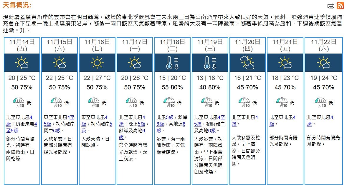 即時熱點 天文台:下周二顯著轉涼 下周三低見13°C (12:03) 發佈於 1 個月 前 2025 年 11 月 13 日 By 明報 【12:02】天文台上午11時30分的天氣概況顯示,下周一(17日)晚上北風增強,下周二(18日)顯著轉涼,下周三(19日)氣溫下降至13至14°C左右。(天文台) 【10:53】天文台今早(13日)9時50分的天氣概況顯示,預料一股強烈東北季候風補充會在下周初抵達華南沿岸,該區天氣顯著轉涼,風勢頗大及有一兩陣微雨。據天文台的香港九天天氣預報,今日至下周一(17日)溫度維持在20°C至27°C範圍(詳見本文附圖),下周二(18日)低見16°C,下周三(19日)進一步跌至最低15°C。(天文台) 相關文章:天文台天氣天氣速遞編輯推介 Up Next 紅葉美景|圖看多倫多白雪紅楓共舞 (10:08) 不要錯過 賞芒草季節 大東山之外 彌勒山郊遊徑、羗山郊遊徑可賞芒草 (13:09) 繼續閱讀 贊助商 猜你喜歡 天氣|天文台:周六晚氣溫顯著下降 下周初低見15、16°C (08:23) 天氣|天文台:日間最高23°C 晚上有一兩陣微雨 (08:15) 天氣|天文台:周三早上有微雨 氣溫介乎20至23°C (20:59) 天氣|天文台:天晴乾燥最高26°C 周末期間顯著轉涼 (08:15) 天氣|天文台:周一天晴乾燥 市區氣溫19°C-25°C 周末北風增強天氣顯著轉涼 (20:01) 天氣|天文台:黃色火災危險警告生效 晚間新界部分地區降至14°C (08:38)
