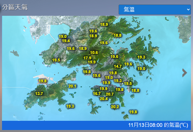 即時熱點 天氣|天文台:短暫時間有陽光及乾燥 最高23°C (08:18) 發佈於 4 週 前 2025 年 11 月 13 日 By 明報 上午8時,天文台錄得氣溫19.9°C,相對濕度68%。 乾燥的東北季候風正影響華南。同時,一道雲帶覆蓋廣東沿岸。本港今早(13日)天氣稍涼,氣溫普遍下降至20°C左右。 本港地區今日天氣預測大致多雲。日間短暫時間有陽光及乾燥,最高氣溫約23°C。今晚有一兩陣微雨。吹和緩至清勁偏北風,初時高地間中吹強風。 展望未來兩三日部分時間有陽光及乾燥。下周初日間溫暖。下周二(18日)及下周三(19日)天氣顯著轉涼,風勢頗大。(天文台) 相關文章:天文台天氣天氣速遞 Up Next 秋冬觀鳥Q&A 11月冬候鳥抵港高峰 觀鳥會介紹4候鳥、觀鳥貼士 (16:00) 不要錯過 全運會預告|11月13日焦點賽事 何詩蓓、麥世霆游泳爭金 陳翔志出戰攀岩決賽 (08:59) 繼續閱讀 贊助商 猜你喜歡 天氣|天文台:周六晚氣溫顯著下降 下周初低見15、16°C (08:23) 天氣|天文台:日間最高23°C 晚上有一兩陣微雨 (08:15) 天氣|天文台:周三早上有微雨 氣溫介乎20至23°C (20:59) 天氣|天文台:天晴乾燥最高26°C 周末期間顯著轉涼 (08:15) 天氣|天文台:周一天晴乾燥 市區氣溫19°C-25°C 周末北風增強天氣顯著轉涼 (20:01) 天氣|天文台:黃色火災危險警告生效 晚間新界部分地區降至14°C (08:38)