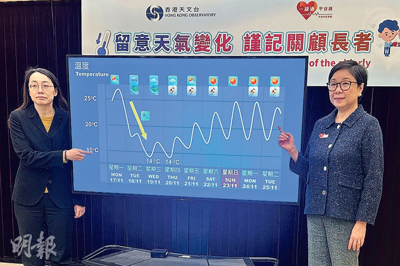 王提醒長者可用「洋蔥式」穿衣法禦寒,即一層一層穿衣,每層不需太厚,內層吸汗、中層保暖,外層防風防水;她亦建議長者善用平安鐘,出門前可用平安鐘確認天氣,有不適時即時按鐘,而照顧者及家人亦要更關心長者。