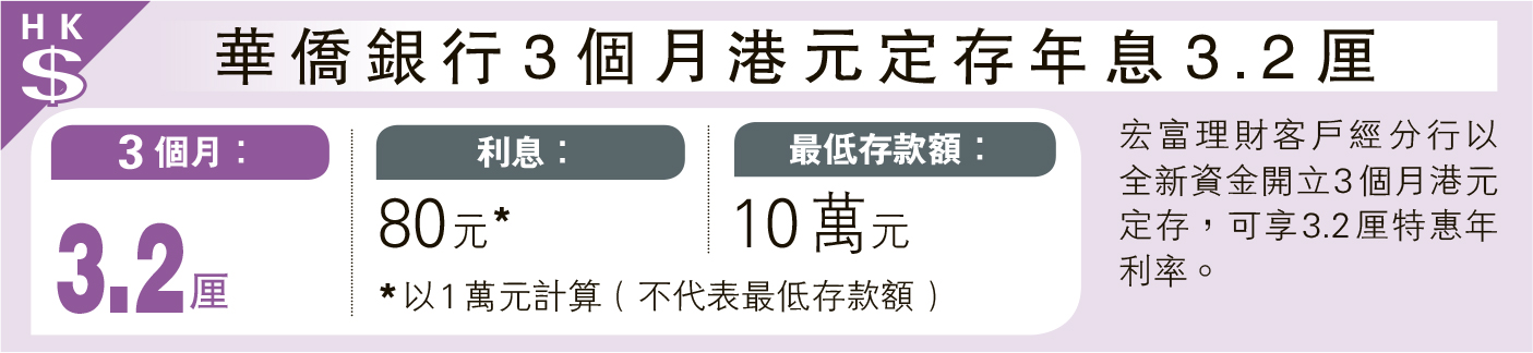 經濟 華僑銀行3個月港元定存年息3.2厘 發佈於 3 週 前 2025 年 11 月 19 日 By 明報 【明報專訊】宏富理財客戶經分行以全新資金開立3個月港元定存,可享3.2厘特惠年利率。 日報新聞-相關報道: 中銀澳元存1個月年利率3.5厘 (2025-11-19) 相關文章:中銀澳元存1個月年利率3.5厘 (2025-11-19) Up Next 中銀澳元存1個月年利率3.5厘 不要錯過 張兆聰:百度處轉型期 短線難看好 繼續閱讀 贊助商 猜你喜歡