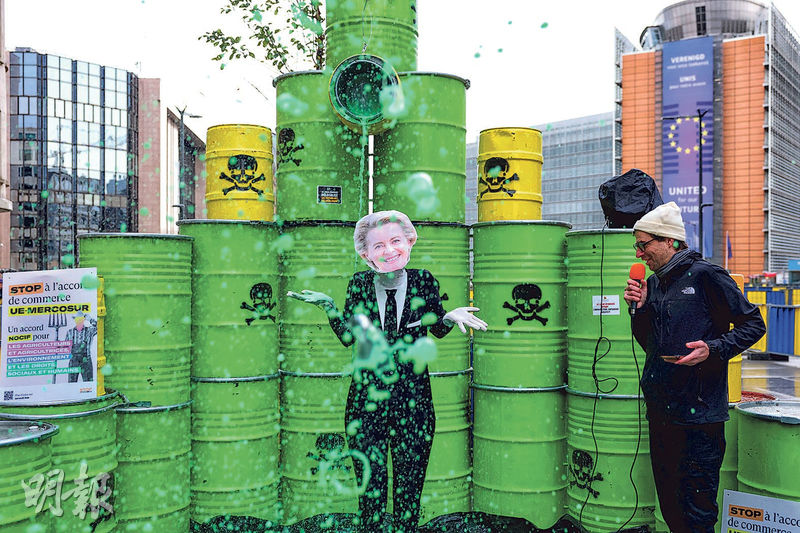 【明報專訊】歐盟跟南美洲民主國家組成的地區貿易組織「南方共同市場」(Mercosur)基本確定自由貿易協議(FTA)。惟協議在歐洲惹起不少反彈,尤其是農林畜牧業界擔心廉宜南美產品搶奪市場,環保人士則警告協議令歐盟禁用的殺蟲劑售往拉美再令「有毒」糧食回流歐洲,並擔心影響氣候行動和糧食主權等——圖中正是提出類似警告的社會活動人士和非政府組織成員,昨天趁歐盟成員國貿易部長在布魯塞爾開會,於會場外舉行名為「有毒貿易之旅」的示威,有示威者扮作歐盟委員會主席馮德萊恩被淋綠油。