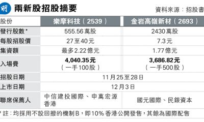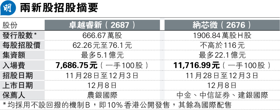 【明報專訊】新股接力上市,內地高等教育機構教學數字化解決方案提供商卓越睿新(2687),以及A股市值近220億元人民幣的晶片研發和設計公司納芯微(2676)昨日起至下周三(12月3日)招股,合共集資最多逾27億元,預期12月8日上市(見表)。