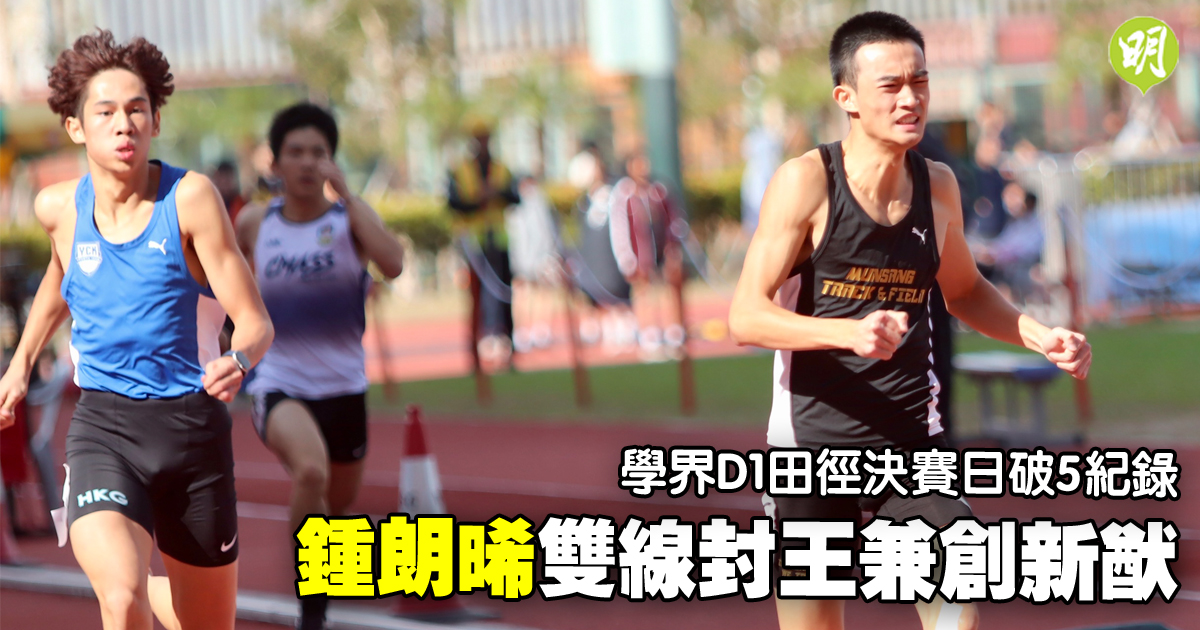 分3日舉行的港九區中學學界第一組(D1)田徑賽今(28日)在灣仔運動場煞科,決賽日共誕生5項新學界紀錄,其中就讀民生書院的鍾朗晞一日內連續打破男子甲組(A Grade)400米跨欄及400米紀錄,收穫兩面金牌;拔萃男書院的劉愷榛則在男子乙組(B Grade)400米決賽刷新紀錄奪冠。
