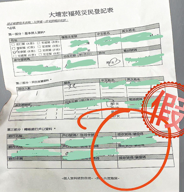 警方昨於社交平台稱,有騙徒使用虛假的「大埔宏福苑災民登記表」渾水摸魚,騙取個人資料、銀行及信用卡資料,甚至要求填寫提款號碼或驗證碼。據警方上載圖片,虛假的災民登記表要求提供基本個人資料、同住家屬資料及轉帳銀行資料,包括住址、中英名姓名、身分證號碼、銀行戶口號碼、提款號碼或驗證碼等。