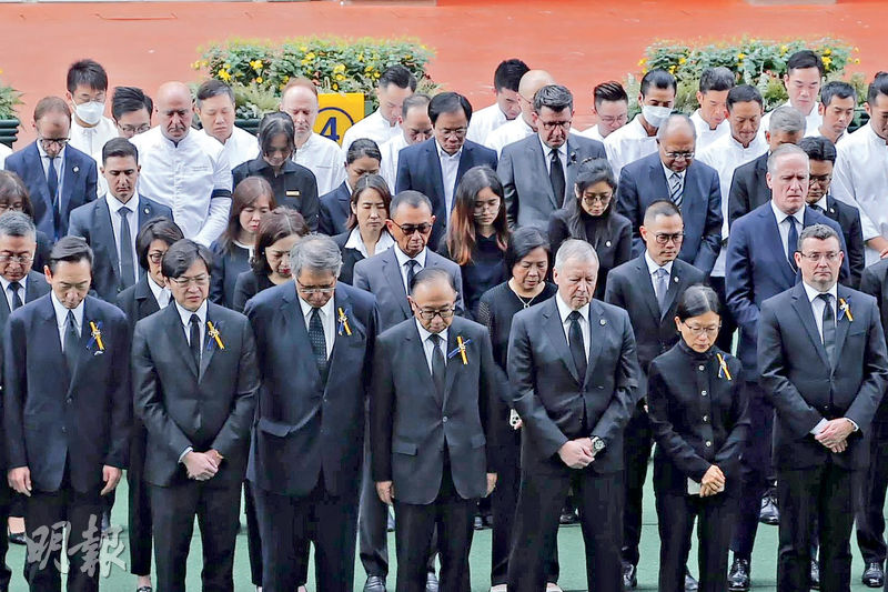 【明報專訊】沙田馬場昨午賽事採閉門形式,以悼念宏福苑火災遇難者,開賽前一眾董事、幹事、員工、練馬師及騎師齊集馬匹亮相圈為罹難者默哀。本周三續有賽事舉行,馬會行政總裁應家柏(前排右三)稱當日雖已過了3天哀悼期,仍非合適時機恢復正常運作,料當日不會閉門作賽,但亦不會舉行「快活星期三」(Happy Wednesday)活動;又說會檢討下星期開始的國際賽周部署,詳情稍後公布。