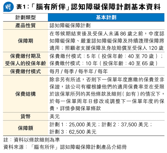 【明報專訊】香港人口老化,預計到2046年每3名市民中,便有1人年屆65歲或以上,而認知障礙症個案更預計於2045年突破39萬宗。由於認知障礙症患者需要長期照護,為不少家庭帶來沉重財務及情緒壓力,有見這方面的需求增加,近日有保險公司推出針對認知障礙症的保障計劃(見表1),若「老友記」有意加強認知障礙症的長期護理保障,不妨留意這類保險產品。