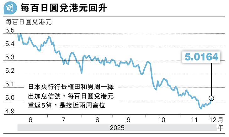 據植田透露,自上月底以來與首相高市早苗及經濟官員溝通順暢。這一表態或暗示政府不會反對央行加息。植田指出,若調整政策為時過晚,可能導致通脹飈升,迫使央行日後加快行動,恐引發市場動盪。他補充,12月的政策決定將考慮薪酬等數據,當利率由目前半厘上調至0.75厘,將進一步闡述央行未來的加息路徑。
