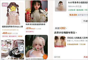 據「澎湃新聞」報道,在內地多個電商平台輸入「童顏娃娃」、「蘿莉娃娃」等關鍵字,除了一般的兒童玩具,還出現不少成人情趣用品,娃娃的尺寸和外觀近似兒童,並帶有仿真性器官設計,以及配套的服裝、用具。