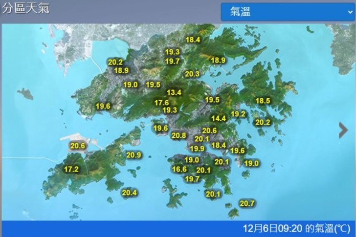 即時熱點 天氣|天文台:天晴乾燥 市區最高23°C (09:30) 發佈於 7 天 前 2025 年 12 月 6 日 By 明報 早上9時20分,天文台錄得氣溫19.9°C,相對濕度73%。 一股東北季候風正為廣東沿岸帶來普遍晴朗的天氣。上午8時,位於菲律賓以東海域的熱帶低氣壓集結在馬尼拉之東南偏東約640公里,預料向西移動,時速約10公里,橫過菲律賓中南部。 本港地區今日(6日)大致天晴及乾燥,日間部分地區能見度較低,最高氣溫約23°C。吹和緩東至東北風。 展望未來一兩日大致天晴,日間乾燥,內陸地區日夜溫差較大。下周中期大致多雲。(天文台) 相關文章:天文台天氣天氣速遞 Up Next 壁畫、積木藝術 點綴深水埗社區 (08:30) 不要錯過 宏福苑火災後應否聖誕聯歡? 社工建議主題改「平安、安慰」 藉節日聚會療傷表關懷 (11:27) 繼續閱讀 贊助商 猜你喜歡 天氣|天文台:周六晚氣溫顯著下降 下周初低見15、16°C (08:23) 天氣|天文台:日間最高23°C 晚上有一兩陣微雨 (08:15) 天氣|天文台:周三早上有微雨 氣溫介乎20至23°C (20:59) 天氣|天文台:天晴乾燥最高26°C 周末期間顯著轉涼 (08:15) 天氣|天文台:周一天晴乾燥 市區氣溫19°C-25°C 周末北風增強天氣顯著轉涼 (20:01) 天氣|天文台:黃色火災危險警告生效 晚間新界部分地區降至14°C (08:38)
