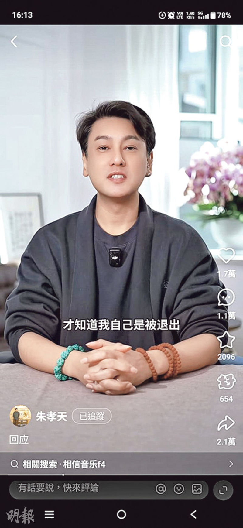 有傳朱孝天因多次在直播爆料被踢出F4,前日他直播稱在拒絕唱片公司「相信音樂」3項要求後,遭單方面切斷聯繫,後來看新聞才知被「退出」F4巡演及新歌計劃,強調與「相信音樂」無合約。