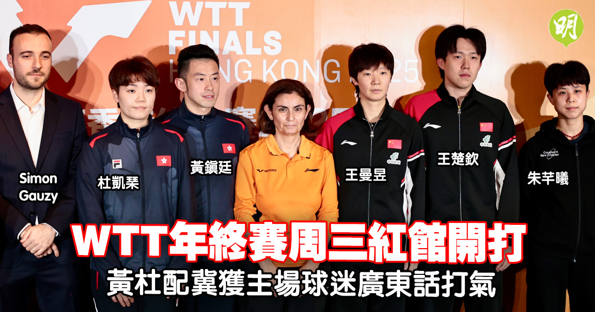 世界乒乓球職業大聯盟(WTT)年終總決賽首度落戶香港並將於本周三於香港紅磡體育館揭開戰幔,今(8日)在香港嘉里酒店舉行抽籤儀式。港隊混雙組合「黃杜配」黃鎮廷(阿廷)/杜凱琹(阿杜)將在小組賽率先對上國家隊兩組強兵,阿杜期待主場球迷前來撐場,「希望聽到更多廣東話打氣聲!」