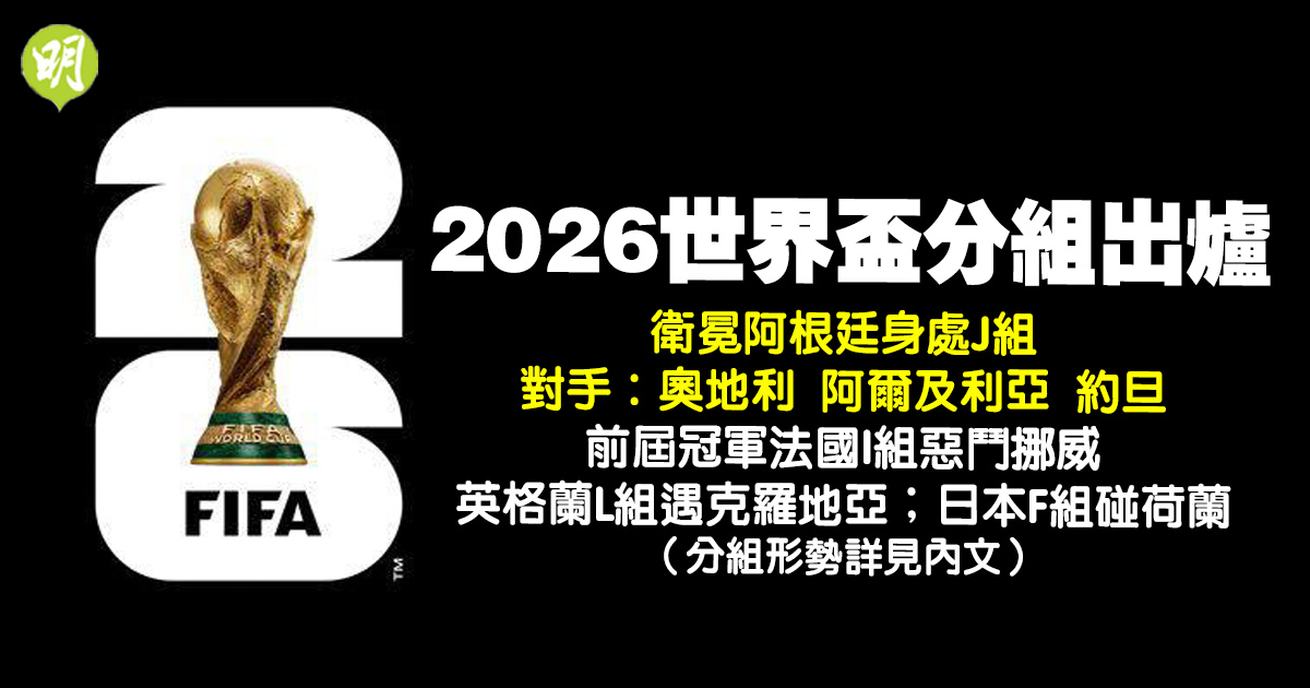 由美國、加拿大及墨西哥聯合舉辦的2026年國際足協(FIFA)男足世界盃決賽周今晨(6日)在華盛頓進行分組賽抽籤儀式。上屆冠軍阿根廷隊身處J組,對手包括奧地利、阿爾及利亞及約旦隊;前屆盟主法國隊在I組將惡鬥挪威隊,意味兩大標誌性巨星基利安麥巴比及艾寧夏蘭特有望碰頭;英格蘭隊則在L組惡鬥過去兩屆取得亞、季軍的克羅地亞隊。至於東亞雙雄韓國及日本隊分列A及F組。