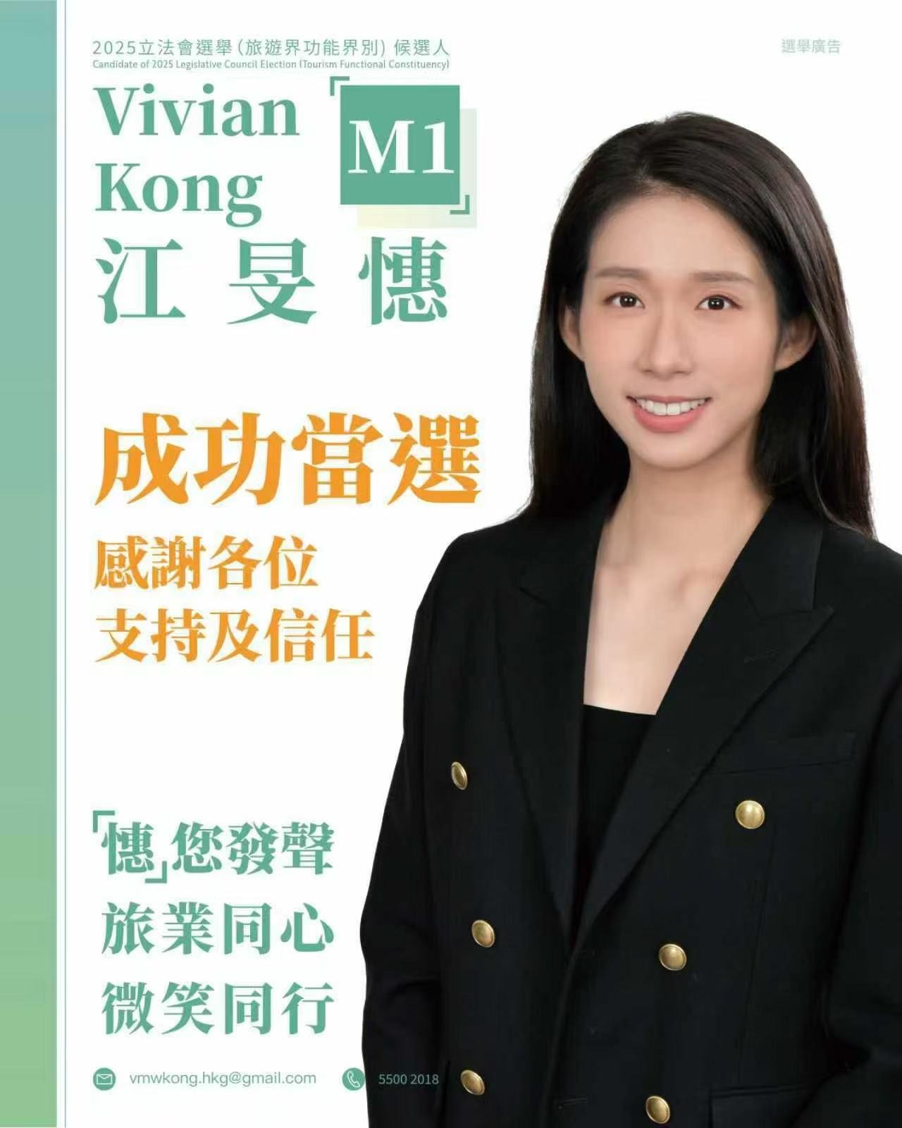 江旻憓日前以131票擊敗只取得23票的對手馬軼超。江旻憓前晚在facebook發文,感謝旅遊業界和市民支持,帖文繼續沿用她競選期間一直使用的綠色和白色主調及半身相。她表示,很榮幸能夠當選旅遊界議員,明白這份信任背後的責任,承諾以務實進取的態度,擔當業界與政府之間的政策推動者和溝通橋樑,確保行業訴求得到「积极」回應,並會推動具前瞻性的旅遊發展策略。