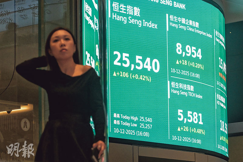 據報萬科(2202)舉行債券人會議談展期,萬科抽升13%,連帶若干民企內房股上升(見表);國企內房股則變動不大,華潤置地(1109)及中海外(0688)升幅均不足1%。科技股普升,阿里巴巴(9988)升1.5%,美團(3690)升2.7%,重回「紅底股」,小米(1810)升1.3%,騰訊(0700)靠穩;美國將允許英偉達向中國出口H200人工智能晶片,但據報中方將限制內地取得和使用H200晶片,晶片股喘定,中芯(0981)一度跌2.4%,收跌0.2%,華虹半導體(1347)升1.2%。