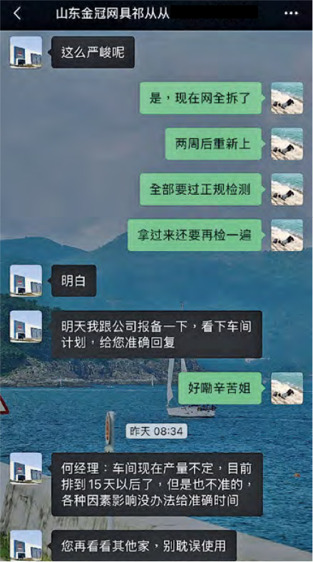 本報經百度旗下「愛採購」平台接觸兩間山東棚網廠家,其中致電「惠民縣森優化纖繩網有限公司」時,職員稱棚網有貨,惟當記者表明想買貨到香港,對方隨即改口說已不再製造建築用棚網, 只售用作鋪在地上防塵的「平網」。記者其後經平台向另一公司「山東創界繩網有限公司」問價,表明是香港買家,對方「已讀不回」。