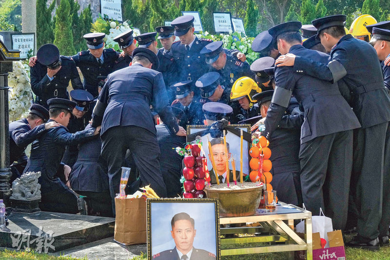 【明報專訊】大埔宏福苑上月26日發生五級火,消防員何偉豪為救人殉職,消防處昨日為他舉行最高榮譽喪禮,靈柩經過宏福苑,再返他任職的沙田消防局響鐘「落更」。一衆親友最後在浩園送別,其同袍圍着靈柩緬懷相處逸事,忍淚低聲道出一聲聲「肥仔、偉豪」、「安息,天堂見」、「你係我哋嘅英雄」,其間多名同袍流淚,互相輕拍對方肩膀安慰,其中一人形容何是沙田消防局的「光榮同驕傲」。這名37歲英勇消防員,最終長眠浩園。