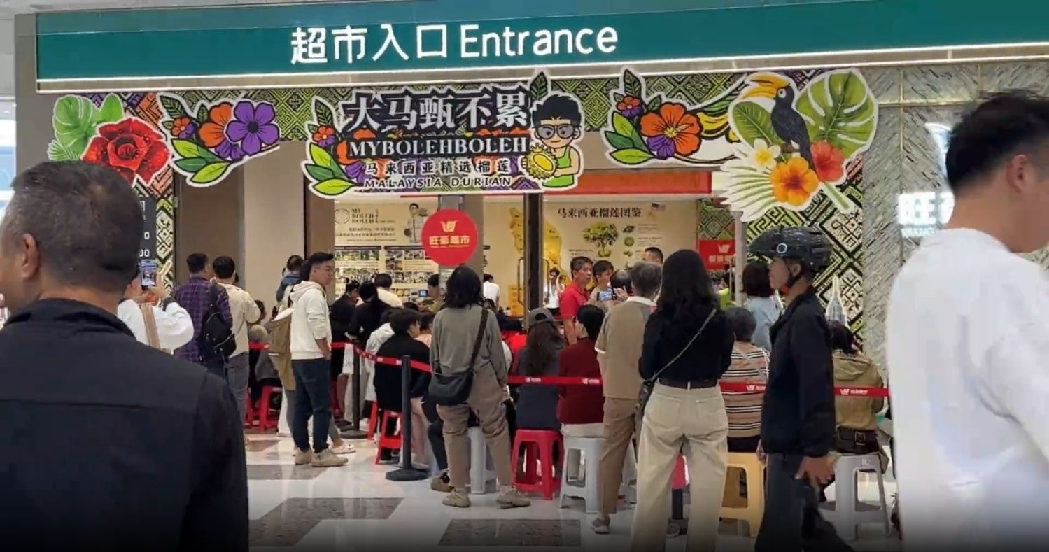 據旺豪超市官方公眾號發布,從吉隆坡運載而來、前天(17日)早上才剛摘下的榴槤,昨日凌晨抵達海口,在海口旺豪超市上架,價格低於平時的一半,現場顧客排起長隊購買。